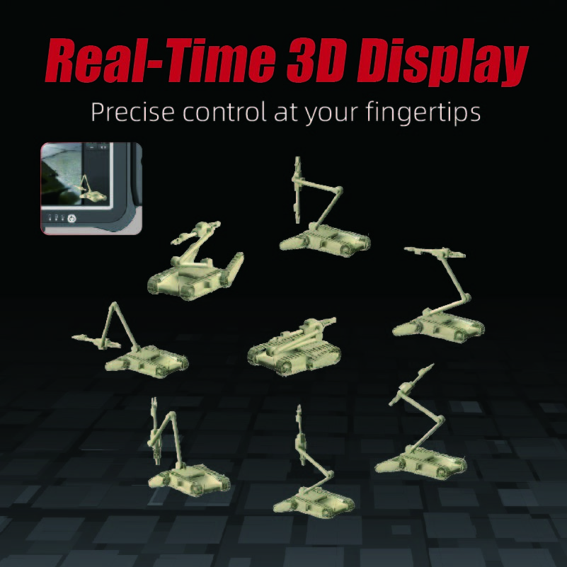 Étant donné que les robots de déminage fonctionnent souvent en dehors de la ligne de vue pendant les missions, des informations en temps réel sur les angles et les positions spatiales des articulations du robot sont cruciales pour les opérateurs. The REOD450 uses high-speed links and advanced computer technology to not only achieve real-time feedback of the robot's status information but also to employ leading 3D virtual display technology for remote real-time display of the robot's 3D statusCela permet au robot de se sentir "à portée de main" même lorsqu'il est "lointain", ce qui permet un fonctionnement plus intuitif.