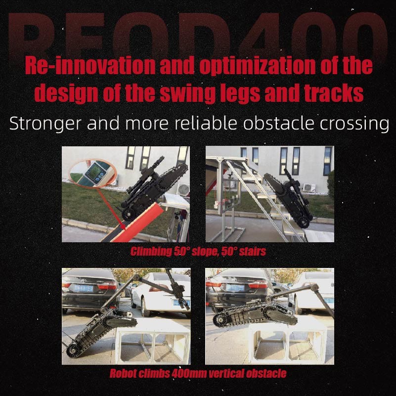 Équipé d'un manipulateurà 8 degrés de liberté, le REOD400 offre un contrôle précis avec une hauteur de préhension maximale de ≥1700 mm (griffe principale) et une distance de préhension la plus éloignée de ≥1380 mm (griffe principale). Le robot prend en charge un affichage vidéo à 7 canaux, permettant des perspectives d'observation plus riches, et dispose de capacités d'affichage en temps réel de la posture 3D à distance. Avec une autonomie de batterie de ≥2 heures à température normale, un indice de protection IP66 pour la résistance à la poussière et à l'eau, et des méthodes de contrôle qui incluent le contrôle par câble jusqu'à 100 m et le contrôle sans fil jusqu'à 1000 m, le REOD400 est conçu pour la fiabilité et la polyvalence dans des conditions difficiles. De plus, il propose des options de personnalisation OEM et ODM pour répondre aux besoins opérationnels spécifiques.