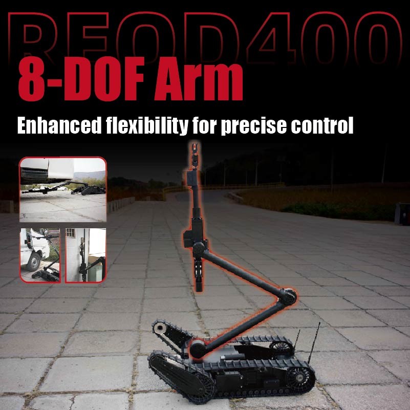 Le bras robotique REOD400 est doté d'une conception intégrée à 8 degrés de liberté, offrant de fortes capacités de portée spatiale. Cette conception permet au bras robotique d'effectuer non seulement des tâches de déminage conventionnelles, mais aussi des opérations que les robots de déminage conventionnels à 5 ou 6 degrés de liberté ne peuvent pas gérer, telles que la saisie d'objets dans des environnements hauts, bas, en fosse profonde ou sur table, ainsi que la réalisation de reconnaissances multi-angles dans des environnements hauts, bas et en fosse profonde.